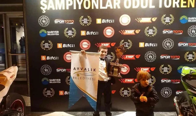 Ödül törenine Ayvalık'ın tanınmış motor ustası Niyazi Çoklar'ın yanı sıra annesi Selin Çoklar ve kardeşi Mert Çoklar ile katılan minik motosikletçi Çağatay Çoklar, kupasına kavuştu.