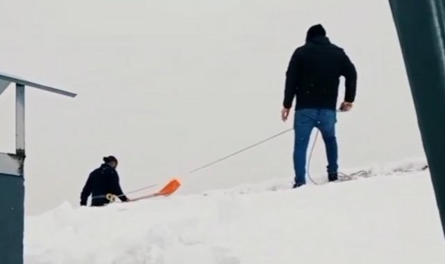 Malatya'nın Yeşilyurt ilçesine bağlı Bostanbaşı Mahallesinde kaydedilen görüntülerde, iki kişinin 14 katlı bir binanın çatısında tehlikeli kar temizliği dikkatlerden kaçmadı. Yoğun kar yağışı ile birlikte birçok çatıda kar çökmelerinin meydana geldiği kentte, cep telefonu kamerasına yansıyan görüntülerde beline bağladığı halat ile çatının ucuna kadar temizlik yapan şahıs yürekleri ağza getirirken, arkadaşı ise ipin ucundan tutarak önlem aldı.