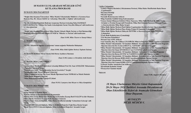 Dünya kültür mirasının korunması ve müzeciliğin daha iyi anlaşılması ve geniş halk kitlelerine en iyi biçimde anlatılarak tanıtılması amacıyla Uluslararası Müzeler Konseyi (ICOM) tarafından tüm dünyada "18 Mayıs Müzeler Günü" çeşitli etkinliklerle kutlanmaktadır. Bu yıl kutladığımız Müzeler Gününde, ICOM Milletlerarası Müzeler Konseyince belirlenen ana tema ise “Müzelerde Eğitim ve Araştırma” olarak belirlenmiştir. Bu kapsamda Milas Müze Müdürlüğünce “Her yerde ve her yaşta sanat” sloganıyla hazırlanan etkinlik programı Milas Kaymakamlığı, Milas Belediye Başkanlığı, Milas İlçe Milli Eğitim Müdürlüğü, Muğla Sıtkı Koçman Üniversitesi Milas Meslek Yüksek Okulu Müdürlüğü işbirliğinde 20-24 Mayıs tarihleri arasında gerçekleştirilecektir.