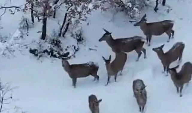 Samsun'un Salıpazarı ilçesinde kışın sert geçmesiyle birlikte yiyecek bulmakta zorlanan yaban geyikleri, vatandaşların kameralarına yansıdı.