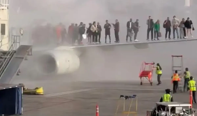 Havalimanı içinden çekilen başka bir video, dumanlar yükselirken yolcuların güvenlik için uçağın kanadında beklediklerini gösterdi.