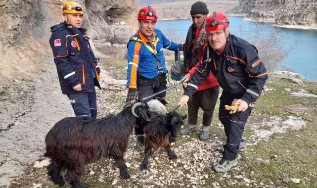 Adıyaman'ın Gerger ilçesinde kayalıkta mahsur kalan 2 keçi AFAD ekipleri tarafından kurtarıldı.