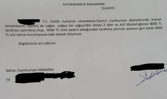 İslahiye ilçesi Cumhuriyet Mahallesi'nde yaşayan Mustafa Özbal ve oğlu Şeyh Şamil Özbal'ın kaldığı evin çatısı, ocak ayında meydana gelen son 54 yılın en şiddetli kar yağışında hasar gördü. Kolluk kuvvetleri ve AFAD ekiplerinin yaptığı hasar tespit çalışmalarının ardından evde yaklaşık 8 bin TL'lik hasar tespit edildi. Hasarın giderilmesi için Özbal ailesine 8 bin lira yardım yapılırken, aile yaklaşık 4 bin TL'lik masraf ile hasarı giderdi. Çatının onarılmasının ardından Mustafa Özbal ve oğlu, devletin verdiği 4 bin TL'yi iade etme kararı aldı. Duyarlı baba ve oğlu, İslahiye Kaymakamlığına verdikleri ''İlçemiz Cumhuriyet Mahallesi'nde ikamet etmekteyim. Ülkemizde yağan yoğun kar yağışından dolayı İl Afet ve Acil Müdürlüğünce 8 bin TL tarafıma yatırılmış olup, 4 bin TL'sinin yeterli olduğundan tarafıma yatırılan paranın geri kalan 4 bin TL'sini tekrar kurumunuza iade etmek istiyorum'' yazılı dilekçe ile parayı geri iade etti.
