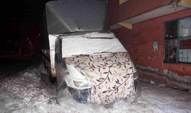 Türkiye'nin en çok kar alan illerinin başında gelen ve çetin kış şartlarının yaşandığı Ağrı'da vatandaşlar park ettikleri araçlarını soğuktan korumak için battaniye, naylon ve branda ile önlem aldı.