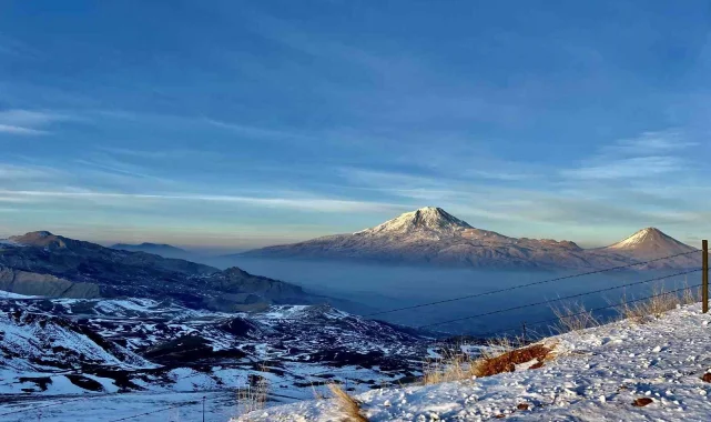 "Türkiye'nin çatısı" olarak bilinen Ağrı Dağı, zirvesindeki beyaz örtüsüyle göz kamaştırıyor.