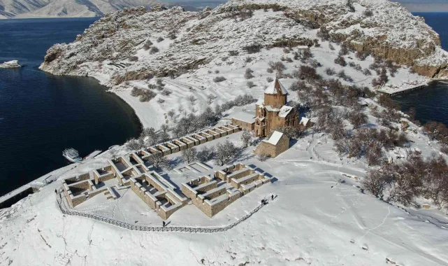 Van Gölü'nde bulunan ve her yıl binlerce yerli ve yabancı turisti ağırlayan Akdamar Adası kar yağışının ardından oluşan beyaz görüntüsüyle ziyaretçilerini büyülüyor.