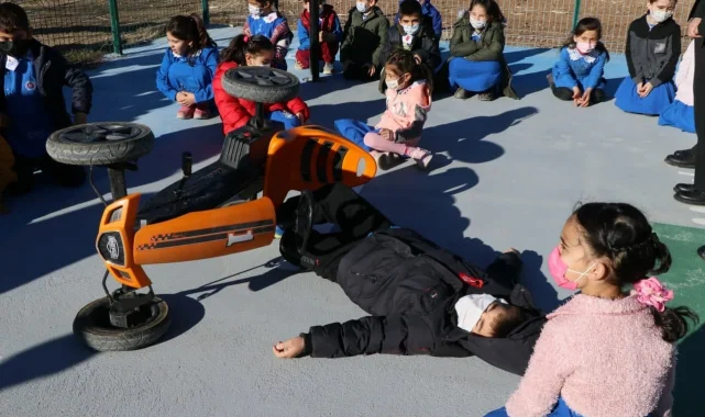 Aksaray'da minik öğrencilere uygulamalı trafik eğitimi veren jandarmanın gerçeği aratmayan eğitimi çocukları hem eğlendirdi hem de bilgilendirdi. Bir kural ihlali sonucu meydana gelen trafik kazasının canlandırılarak anlatıldığı eğitimde çocuklar yola savruldu, kullandıkları araçlar devrildi.