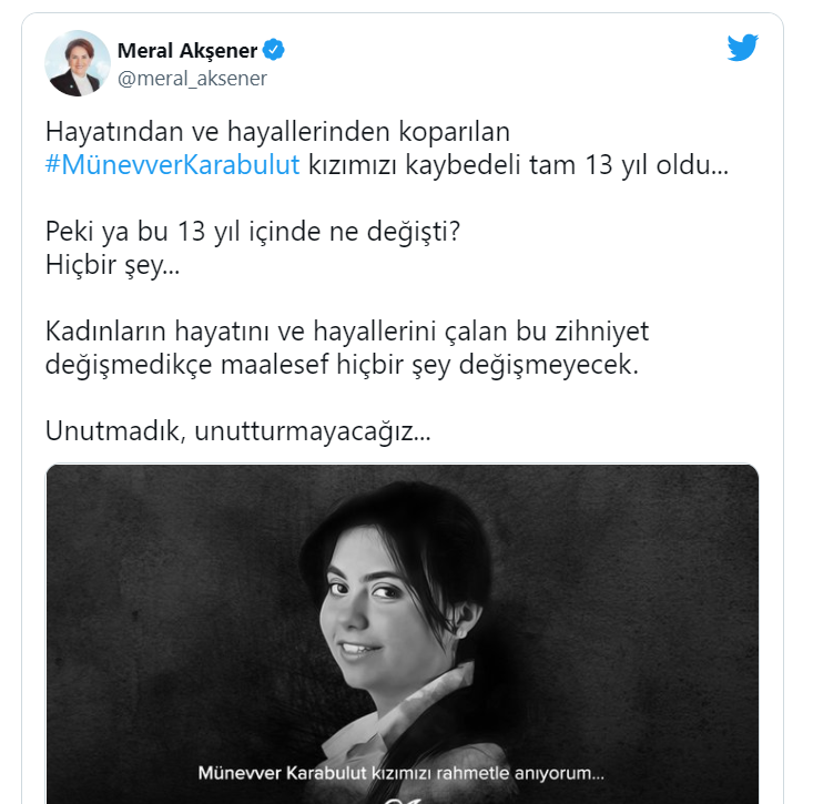 İyi Parti lideri Akşener Twitter paylaşımında, 'Hayatından ve hayallerinden koparılan #MünevverKarabulut kızımızı kaybedeli tam 13 yıl oldu... Peki ya bu 13 yıl içinde ne değişti? Hiçbir şey... Kadınların hayatını ve hayallerini çalan bu zihniyet değişmedikçe maalesef hiçbir şey değişmeyecek. Unutmadık, unutturmayacağız...' dedi.