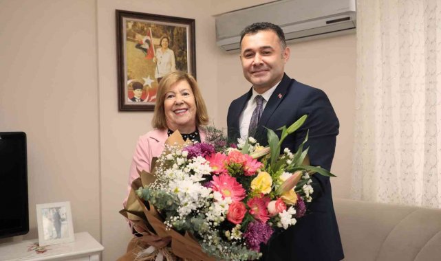 Başkan Yücel, İlkokul Öğretmeni Müşerref Demirci'ye ziyaretin anısına çiçek takdim ederek hatıra fotoğrafı çektirdi.