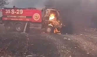 İzmir’in Foça ilçesinde çıkan orman yangınına müdahale çalışmaları sürerken, yangınla mücadeleye destek için bölgeye gönderilen Manisa’nın Gördes ilçesindeki Orman İşletme Müdürlüğü’ne ait bir itfaiye aracı alevlerin arasında kalarak yandı.