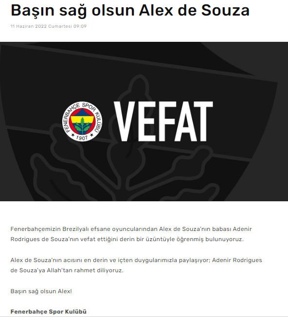 "Efsane oyuncularımızdan Alex de Souza'nın babası Adenir Rodrigues de Souza'nın vefat ettiğini derin bir üzüntüyle öğrenmiş bulunuyoruz. Alex ve tüm Souza ailesinin acısını en derin ve içten duygularımızla paylaşıyor, Adenir Rodrigues de Souza'ya Allah'tan rahmet diliyoruz" ifadeleri kullanıldı.