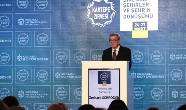 Türkiye'ye sempatisiyle bilinen, iç ve dış siyasette izlediği tutarlı politikalarla tanınan eski Almanya şansölyesi Gerhard Schröder, "Nazik davetlerinizden ötürü Kocaeli Büyükşehir Belediyesine teşekkür ederim. 2022 Kartepe Zirvesi dirençli şehirler temasıyla gerçekleşiyor. Bu temayı seçmek, şehrin dönüşümüne odaklanmakla aslında en önemli konuya parmak basıyorsunuz. Şehir ve kentselleşmenin sorunlarını görüp bunu kalkınma durumuna çevirmek zorundayız" diye konuştu.