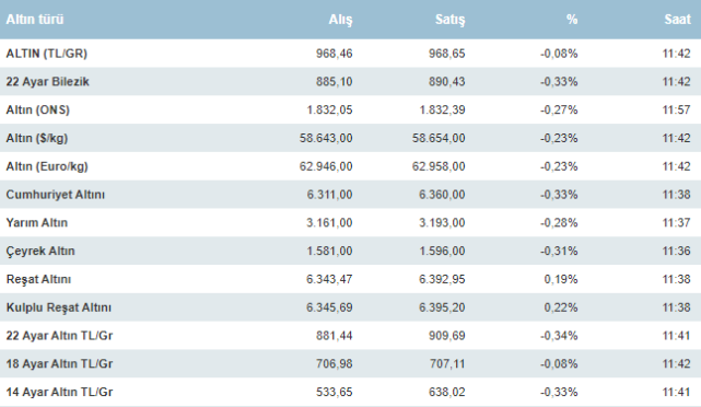 Gram altın 968 liradan fiyatlanırken, dün günü 969 liradan kapadı.