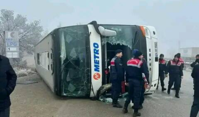 Ankara'nın Kalecik ilçesi Çandır mevkiinde 06 DT 5502 plakalı yolcu otobüsü, gizli buzlanmadan dolayı sürücüsünün direksiyon hakimiyetini kaybetmesi sonucu yoldan çıkarak devrildi.