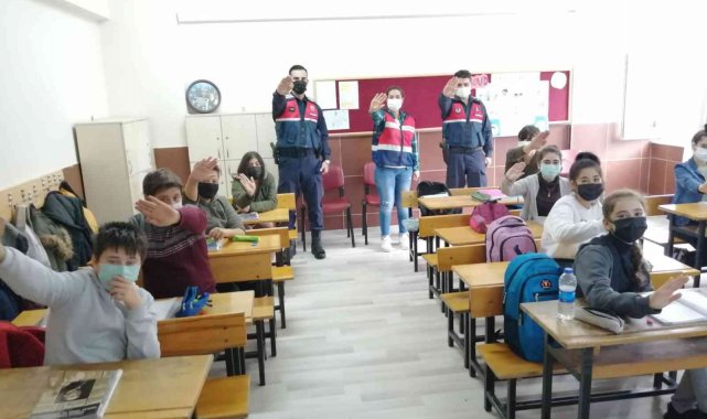 Antalya'nın Döşemealtı ilçesinde Jandarma ekipleri, 8. sınıf öğrencilerine 'Aile İçi ve Kadına Yönelik Şiddetle Mücadele ile KADES' bilgilendirme eğitimi verdi.