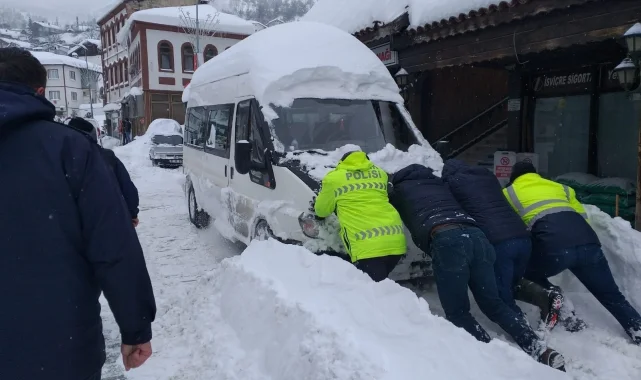 Kastamonu'nun Küre ilçesinde kar yağışı sebebiyle yollarda kalan araçları, polis ekipleri vatandaşlarla birlikte iterek çıkardı.
