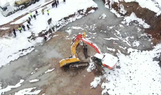 İş makinesinin buz kaplı çukur üzerimde ilerlediği sırada buzun kırılması ve iş makinesinin çukura düştüğü anlar kameraya yansıdı. Görüntülerde iş makinesi buzun üzerinden ilerlediği sırada buzların kırıldığı, iş makinesinin de devrilerek içi su dolu çukura düştüğü görülüyor.