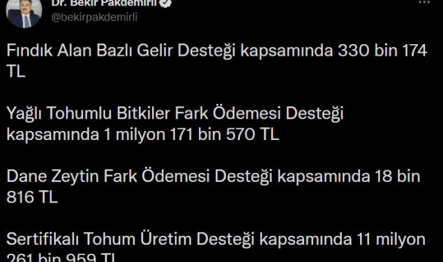 Tarım ve Orman Bakanı Bekir Pakdemirli, sosyal medya hesabından yaptığı paylaşımda, Büyükbaş Damızlık Hayvan Alımı Desteği kapsamında 855 bin 200 lira, Hububat Baklagil Dane Mısır Fark Ödemesi Desteği kapsamında 208 bin 766 lira, Fındık Alan Bazlı Gelir Desteği kapsamında 330 bin 174 lira, Yağlı Tohumlu Bitkiler Fark Ödemesi Desteği kapsamında 1 milyon 171 bin 570 lira, Dane Zeytin Fark Ödemesi Desteği kapsamında 18 bin 816 ve Sertifikalı Tohum Üretim Desteği kapsamında 11 milyon 261 bin 959 lira ile toplamda 13 milyon 846 bin 495 bin liralık destek ödemesinin hesaplara aktarılmaya başlandığını kaydetti.