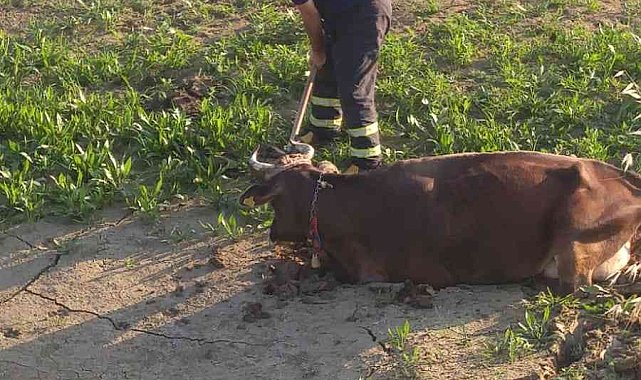Balçığa saplanan ineği itfaiye ekipleri kurtardı