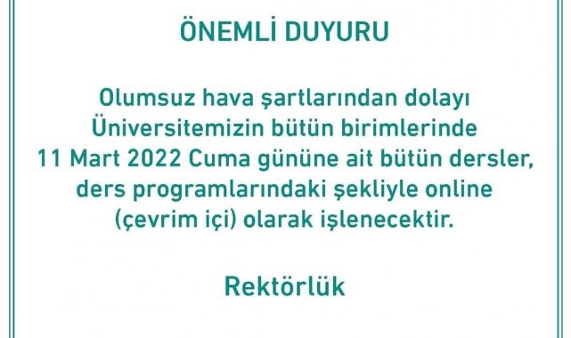 Balıkesir Üniversitesi Rektörlüğünden yapılan açıklama, "Olumsuz hava şartları dolayı üniversitemizin bütün birimlerinde 11 Mart 2022 Cuma gününe ait bütün dersler, ders programlarındaki şekliyle online (çevrim içi) olarak işlenecektir" denildi.