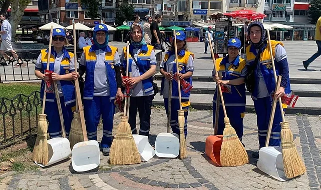 Balıkesir'in Bandırma ilçesinde cumhuriyet meydanında kadın temizlik görevlileri iş başı yaptı.