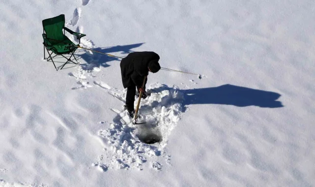 Baraj gölündeki 40 santimlik buzu kazma ile kırıp balık tutuyorlar