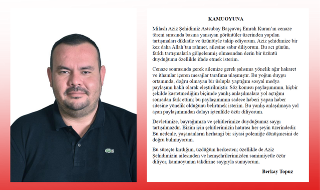 Muğla Gazeteciler Cemiyeti (MGC) Başkanı ve Türkiye Gazeteciler Federasyonu (TGF) Yönetim Kurulu Üyesi Süleyman Akbulut, Milaslı şehidimiz Astsubay Başçavuş Emrah Kuran’ın cenaze töreni sonrası yaşananların ardından, Milas Belediye Başkanı Fevzi Topuz’un CHP İl yönetim Kurulu üyesi de olan oğlu Berkay Topuz’un tepki toplayan sosyal medya paylaşımı sonrası servis ettiği özür açıklamasına yönelik yazılı bir açıklamada bulundu.