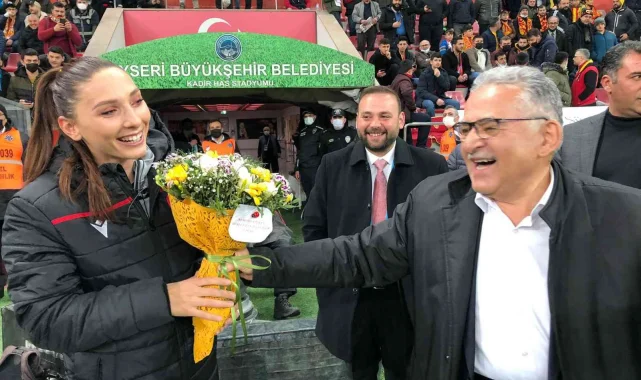 Kayseri Büyükşehir Belediye Başkanı Dr. Memduh Büyükkılıç, Yukatel Kayserispor-Alanyaspor maçı öncesi dördüncü hakem Gamze Durmuş Pakkan'a, 8 Mart Dünya Kadınlar Günü dolayısıyla çiçek takdim ederek, Kadınlar Günü'nü tebrik etti.