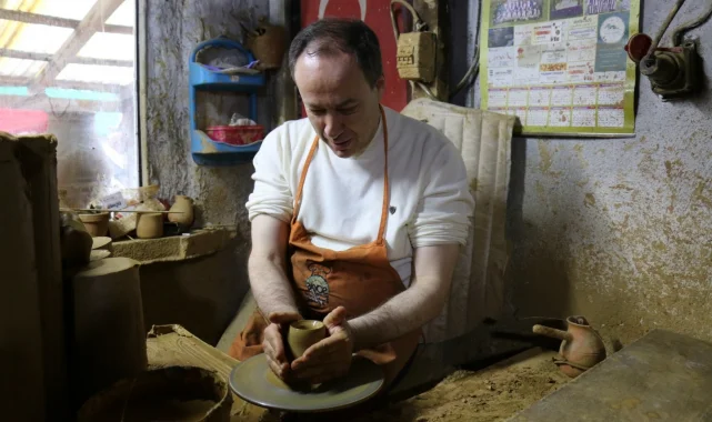 Sakarya'nın Geyve İlçe Belediye Başkanı Murat Kaya, Pazaryeri Belediye Başkanı Zekiye Tekin'i ziyaretinde çarkın başına geçip çömlek yaptı.