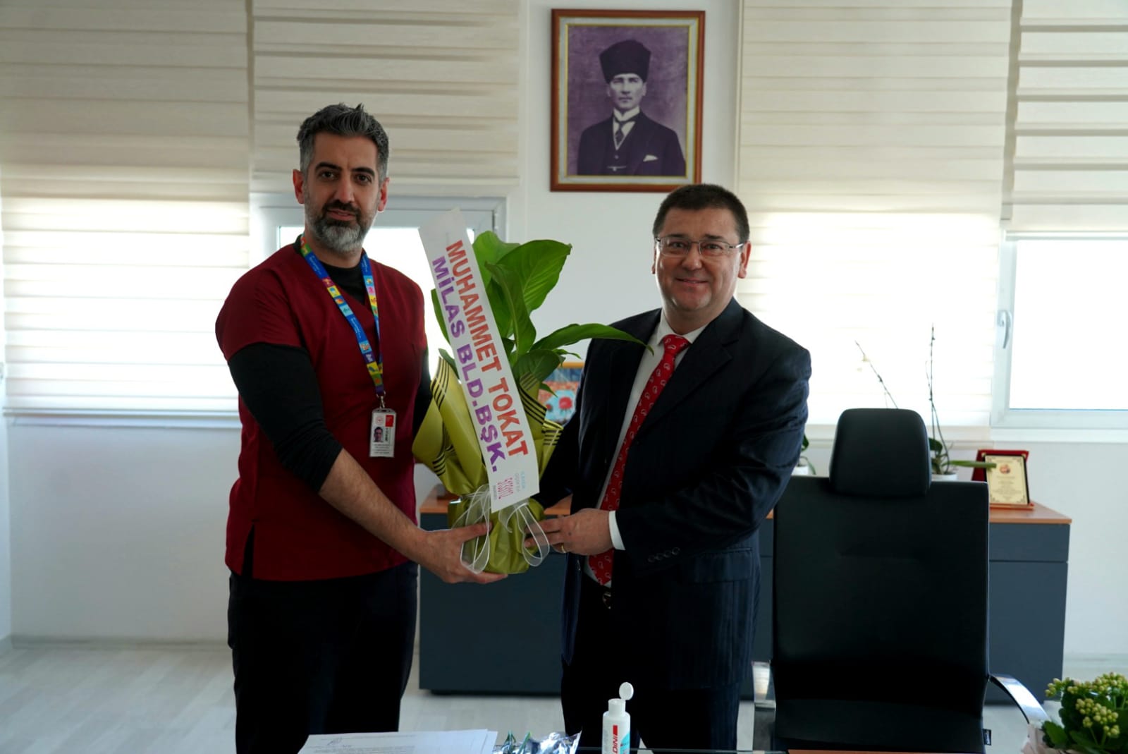 Eşi Elif Tokat ve beraberindeki heyet ile birlikte Milas Devlet Hastanesi’nde görev yapan doktorları ve Başhekim Uzm.Dr.Tarık Çubukcuoğlu’ nu ziyaret eden Başkan Tokat, sağlık emekçilerine çiçek takdim etti.