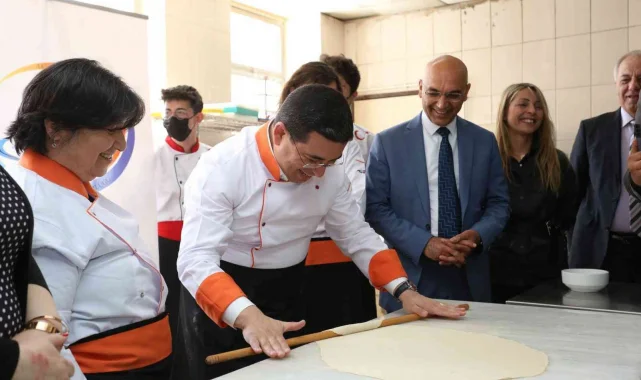 Gençlik Buluşmaları'nda Falez Mesleki ve Teknik Anadolu Lisesi'ne konuk olan Kepez Belediye Başkanı Hakan Tütüncü, turizme kalifiyeli eleman yetiştiren okulun Yiyecek İçecek Hizmetleri Bölümünde mantı hamuru açtı.