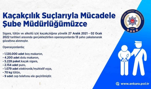 Ankara Emniyet Müdürlüğü Kaçakçılık Suçlarıyla Mücadele Şube Müdürlüğü ekiplerince, sigara, tütün ve alkollü içki kaçakçılığını önlemeye yönelik 27 Aralık 2021-02 Ocak 2022 tarihleri arasında gerçekleştirilen operasyonlarda 13 şüpheli gözaltına alındı.
