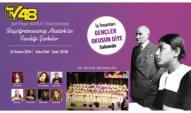 24 Kasım 2024 Pazar günü saat 20.00’de Azka Otel’de Bodrum Belediyesi, C-Majör Türkiye İşten Sesler Korosu, Türk Eğitim Vakfı (TEV) iş birliğiyle ve Bodrum Belediyesi Kültür AŞ organizasyonuyla C-majör Koro Şefi Pınar Barut’un yönetiminde “Başöğretmen Atatürk’ün Sevdiği Şarkılar” seslendirilecek.