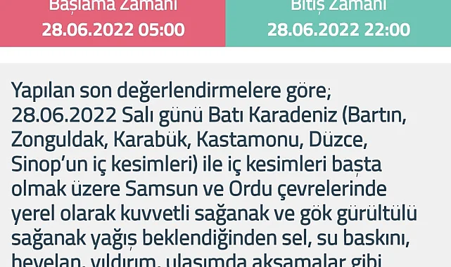 Meteoroloji'den 28 Haziran Salı günü için yapılan uyarıda, Batı Karadeniz ile Samsun-Ordu çevrelerinde kuvvetli sağanak beklendiği bildirildi.