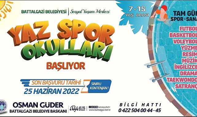 Çocuklara ve spora yönelik çalışmalarını aralıksız sürdüren Battalgazi Belediyesi tarafından hayata geçirilen Yaz Spor Okulları ile çocuklar yazın keyfini doyasıya çıkaracak. Sosyal ve bedensel gelişimlerine katkı sağlamalarının yanı sıra çocukların yaz ayını verimli bir şekilde geçirmelerini sağlamak amacıyla 25 Haziran'da Sosyal Yaşam Merkezi'nde açılacak olan Yaz Spor Okulları, dönemsel olarak devam edecek ve 1.dönemi bir ay sürecek. Sınırlı kontenjana sahip Yaz Spor Okulunda; İngilizce derslerinden Dramaya, Futboldan Basketbola, Resimden Müziğe, Voleyboldan Yüzmeye ve Taekwondodan Satranca kadar birçok sportif ve sanatsal etkinlikler yer alacak. Alanında uzman eğitmenler eşliğinde verilecek olan eğitimlerden 7-15 yaş grubu çocuklar yararlanabilecek.