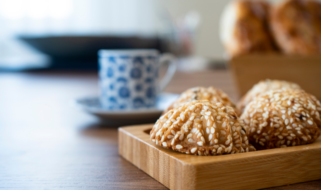 *Hamurdan kabuklu ceviz boyutunda yuvarlaklar yaparak susama bulayın, kalıba alıp bastırarak şekil almasını sağlayın ve hafifçe tezgaha vurarak kalıptan çıkartıp ters çevirerek fırın kağıdı serilmiş tepsiye aralıklı olarak sıralayın.