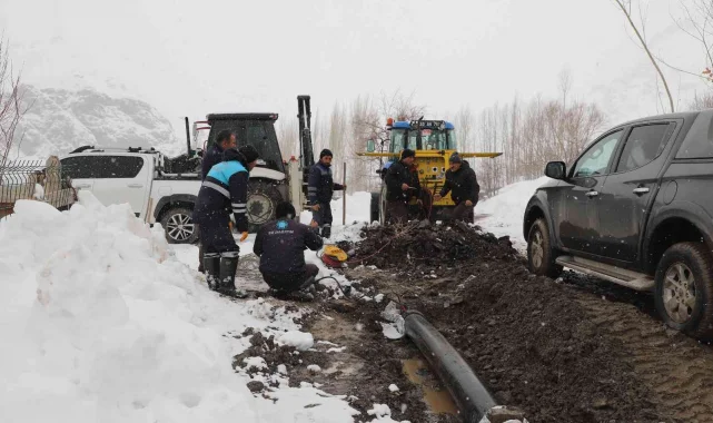 Hakkari Belediyesi ekipleri, Otluca köyü Uyanık mezrasında kar yağışı ve tipi altında su arızasını giderdi.