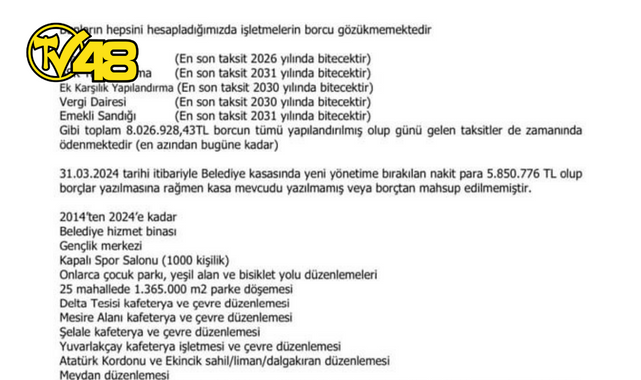Açıklamada ise şu ifadelere yer verildi: "19.319.201,27 TL ,borçla aldığımız belediyeyi, 90.159.990,70 TL yani 2.774.153 dolar (işletmenin depolarındaki malzemeler, kasalardaki 6,5 milyon nakit para, günü gelmeyen taksitler-yıllara sâri ödemeler dâhil) borçla alnımızın akıyla teslim etmiş bulunmaktayız.