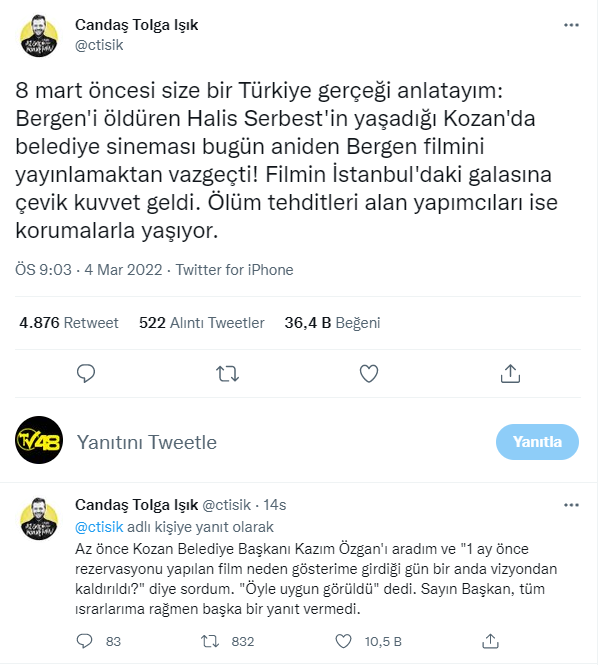 Gazeteci Candaş Tolga Işık, Twitter hesabından yaptığı bir açıklamada "Bergen" filminin, sanatçıyı katleden Halis Serbest’in yaşadığı Adana Kozan’da gösterime gireceği gün kaldırıldığını aktardı. Işık ayrıca konuyla ilgili olarak Kozan Belediye Başkanı’nı aradığını ve ‘1 ay önce rezervasyonu yapılan film neden gösterime girdiği gün bir anda vizyondan kaldırıldı?’ diye sorduğunu ancak Belediye Başkanı Kazım Özgan’ın, ‘Öyle uygun görüldü’ dediğini aktardı.