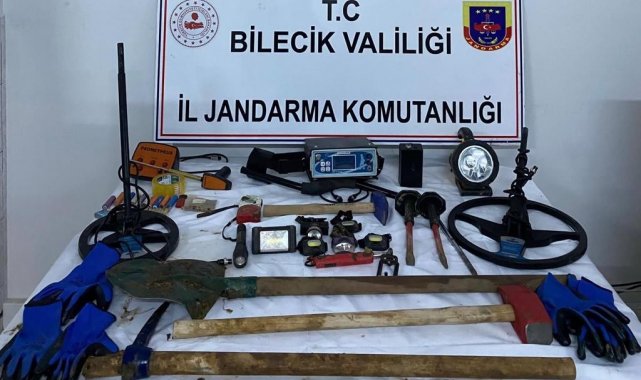 Bilecik İI Jandarma Komutanlığı ekipleri Bozüyük ilçesinde tarihi eser bulmak maksadıyla izinsiz kazı yapıldığını tespit etti. Yapılan operasyonda Y.H., H.M., S.A. ve İ.G., isimli şahıslar suçüstü yakalandı. Şahıslar ile birlikte kazı esnasında kullanılan 2 adet dedektör, 18 adet muhtelif inşaat malzemesi ve 7 adet aydınlatma feneri ele geçirildi. Ele geçirilen malzemelere el konulurken, 2 şahıs ise gözaltına alındı.
