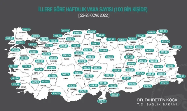 Sağlık Bakanı Fahrettin Koca, sosyal medya hesabı üzerinden 22-28 Ocak tarihleri arasındaki il bazında 100 bin kişi içindeki bir haftalık toplam yeni Covid-19 vaka sayısını paylaştı. Paylaşıma göre son bir haftada il bazında her 100 bin kişide vaka sayısı Bilecik'te 628,21 olarak kayıtlara geçti. Bu rakam geçtiğimiz hafta 678,50 olarak kayıtlara geçmişti.