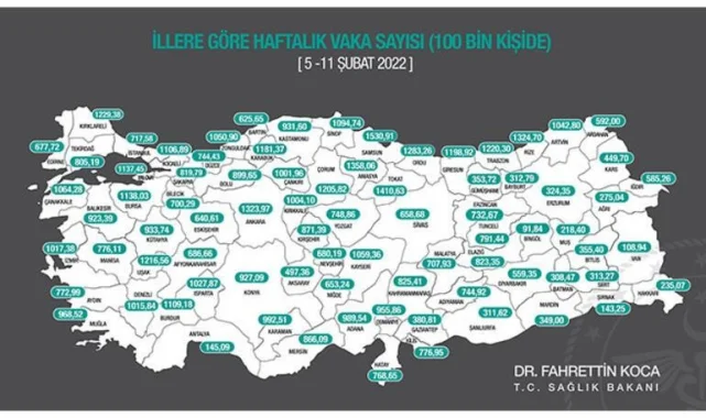 Sağlık Bakanı Fahrettin Koca, sosyal medya hesabı üzerinden 12-18 Şubat tarihleri arasındaki il bazında 100 bin kişi içindeki bir haftalık toplam yeni Covid-19 vaka sayısını paylaştı. Paylaşıma göre son bir haftada il bazında her 100 bin kişide vaka sayısı Bilecik'te 677,95 olarak kayıtlara geçti. Bu rakam bir önceki hafta 703,19 geçtiğimiz hafta ise 700,29 olarak açıklanmıştı.