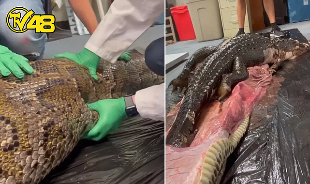 ABD'nin Florida eyaletinde hareket edemediği için ölen 5.5 metre büyüklüğündeki boğa yılanını inceleyen veterinerler, yılanın 1.5 metre büyüklüğünde bir timsahı yediğini fark etti.