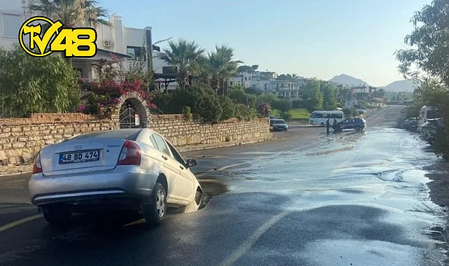 Muğla'nın Bodrum ilçesinde ana isale hattı patladı. Patlamanın ardından yolda dev çukur oluştu. bölgeden geçen otomobil ise çukura düşerek mahsur kaldı.
