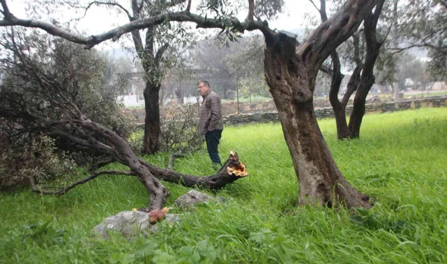 Muğla'nın Bodrum ilçesinde hortum nedeniyle 10'dan fazla zeytin ağacı zarar görürken, bir evin paneli de uçtu.