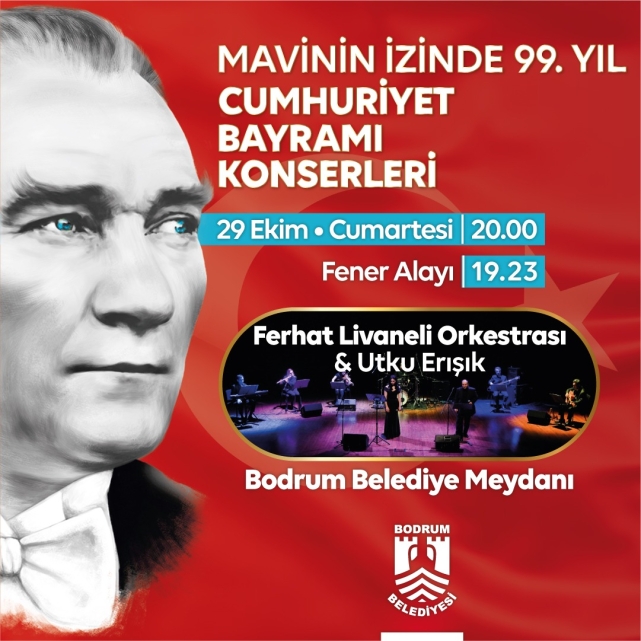 Bodrum Belediyesi Kültür ve Sosyal İşler Müdürlüğü organizasyonu ile Bodrum Belediye Meydanı’nda ve Turgutreis Atatürk Meydanı’nda halk konserleri düzenlenecek. Saatler 19.23’ü gösterdiğinde fener alayı ile başlayacak olan etkinliklerde Bodrum Belediye Meydanı’nda, Hakan Doğanay’ın sunumuyla Ferhat Livaneli Orkestrası sahne alacak. Belediye Meydanı’ndaki konser programı içinde yer alacak bazı sürprizler ise kutlama coşkusuna heyecan katacak.