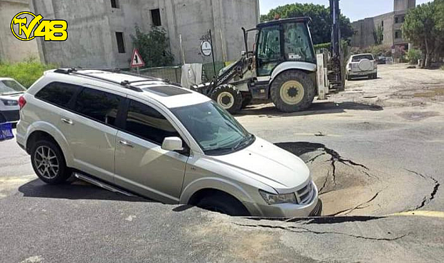 Bodrum'da yoldan geçen araçlar yolun yarılmasıyla birlikte aşağıya çöküyor.