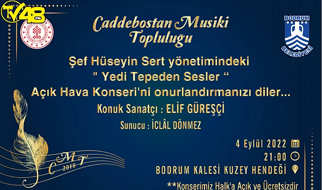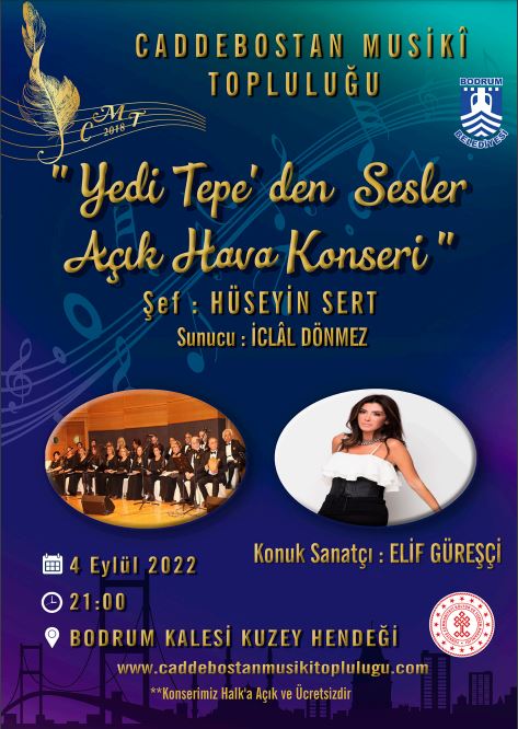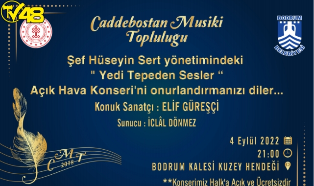 Bodrum Kalesi Kuzey Hendeği'nde düzenlenecek olan Şef Hüseyin Sert yönetimindeki ''Yedi Tepeden Sesler'' açık hava konseri, halka açık ve ücretsiz yapılacak. 4 Eylül 2022 tarihinde gerçekleştirilecek olan konser Cadde Bostan Musiki topluluğu tarafından organize edilen konserde konuk sanatçı olarak Elif Güreşçi sahne alacak.