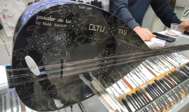 Erzurum'da yapımı 2 yıl süren ve 22 yıldır sapasağlam duran Oltu taşından yapılan bağlama, görenleri kendine hayran bırakıyor. Birçok talibi olan bağlamaya sahibi ise paha biçemiyor.
