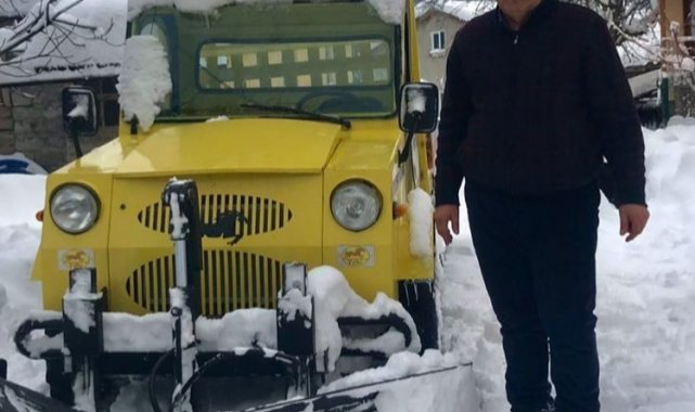 Sinop'un Türkeli ilçesinde bir köy muhtarı, kış aylarında kar yağışı nedeniyle kapanan köyün mahalle yollarını kısa sürede açmak için sadece köyün hizmetlerinde kullanma amaçlı araç imal etti.